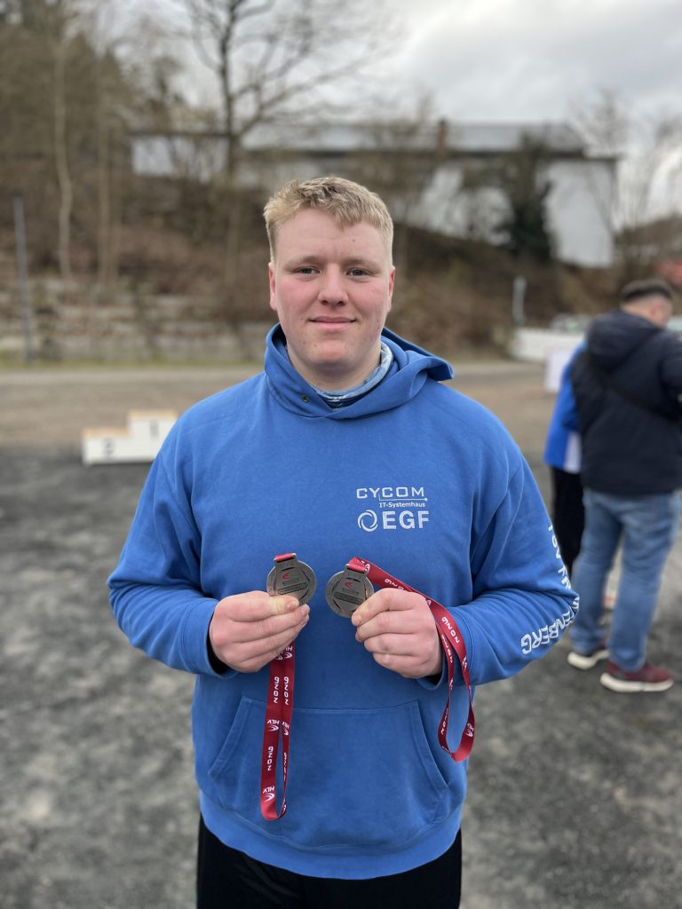 Gleich zum Auftakt stieß Linus die 5kg-Kugel auf gute 13,76m. Trotz Technikumstellung im Herbst lieferte er dabei wieder eine stabile Serie, kommt aber noch nicht optimal hinter die Kugel. Mit Bronze kann er in der guten Konkurrenz sehr zufrieden sein.