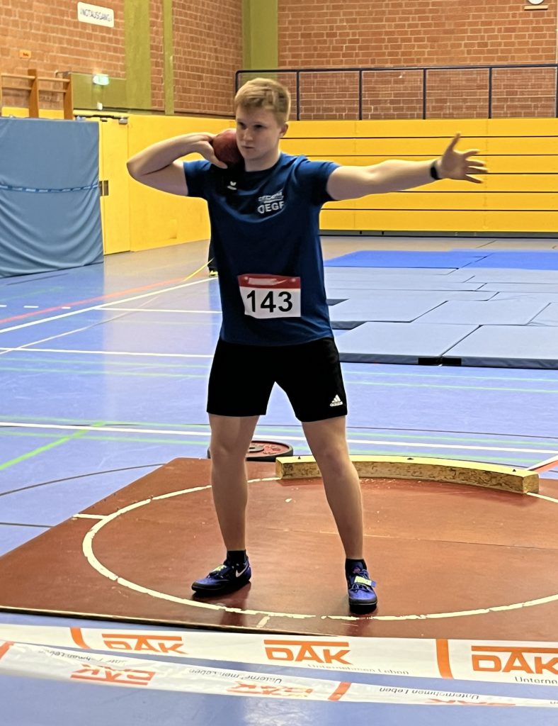 Im Kugelstoßen holte Linus standesgemäß die Gold-Medaille. Dafür lies er es sich nicht nehmen, den Titel mit neuer Bestweite von 14,09m nach Hause zu holen!